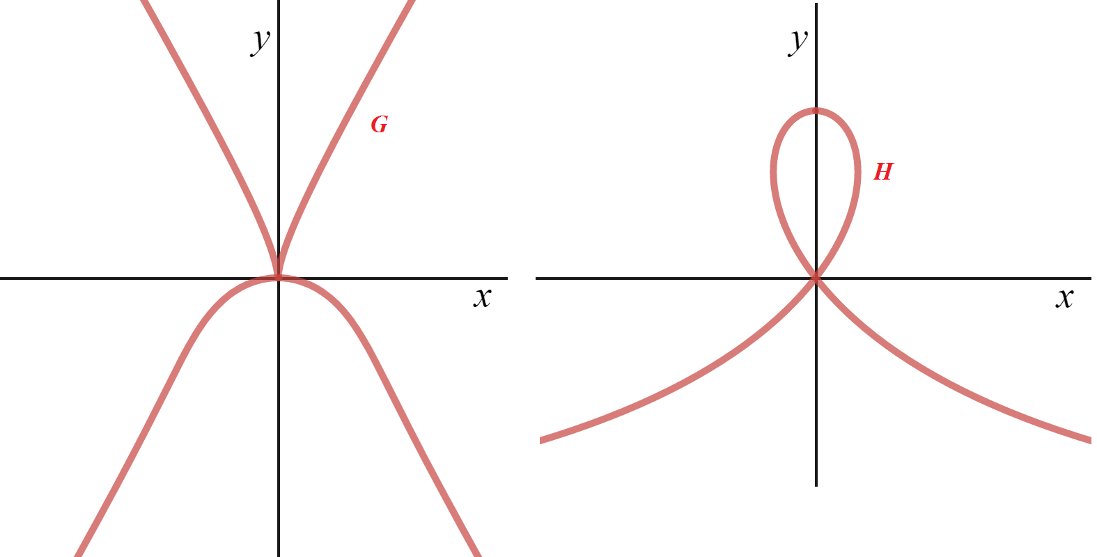 Recall that F, the four-petal rose, has two branches tangent to the x-axis at O. G has only one, and H has none. Note that we remove a factor of y passing from F′ to G, and from G′ to H.