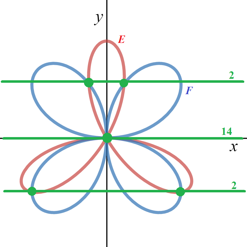 Remember also the local-global feature of Bézout’s Theorem: we need to total up all the branch-branch multiplicities at an intersection, and then sum this over all intersections. Kendig’s first definition already sums over the branches of the curve F. The second definition sums over horizontal lines when using resx(y), or vertical lines when using resy(x). For example, the roses: