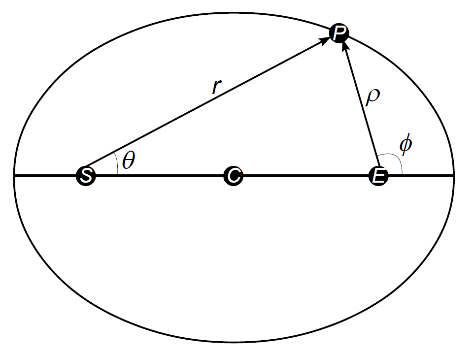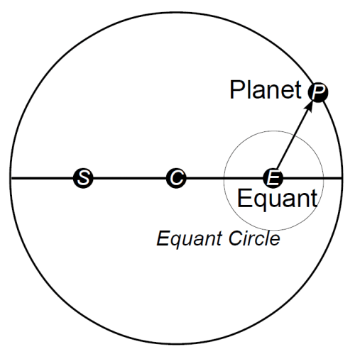 We want the Sun S, the center C of the orbit, and the equant E to lie on a straight line, with the center bisecting the line segment SE. The vector rotates with constant angular velocity, though of course its length changes. Ptolemy did not talk about rotating vectors. Instead he employed an equant-centered circle, with a point moving uniformly on the circumference; he then extended a line from the equant through that point till it intersected the circle1. The equant-centered circle was called the equant circle, or sometimes just equant, context indicating whether point or circle was intended.