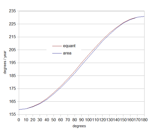 The vertical and horizontal lines through the circle’s center divide the circular region into four equal-area sectors. But the two dotted regions are pretty close in area. So the two slanted lines, plus the horizontal axis, divide the circular region into four sectors with nearly equal areas. Therefore the times at those four locations will be nearly the same for both the equant and area speed laws.