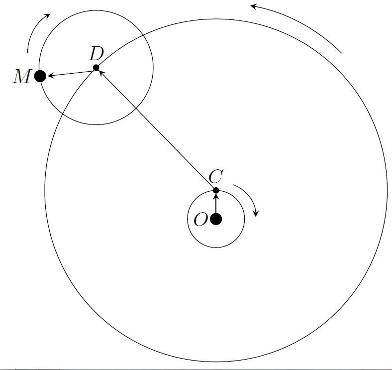 The Moon M is carried on an epicyle with center D. D in turn is carried by a deferent with center C. Finally, the center of the deferent is carried by a small inner circle whose center is the Earth O. The epicycle and inner circle rotate in the opposite direction from the deferent.