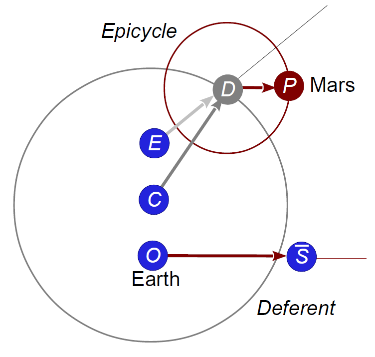 As the Sun’s orbit is actually a Keplerian ellipse, we should use eccentric circles with equants for the epicycles. Ptolemy does not do this. In effect, he replaces the true Sun S with the mean Sun S. He retains the eccentricity and equant only for the deferent. As a result, the epicycle vector rotates uniformly, and would be equal to