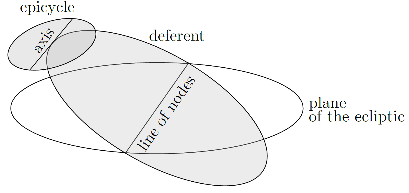 The diagram below displays the essential features of the latitude models. The deferent is tilted with repect to the plane of the ecliptic, intersecting it along the line of nodes. The epicycle is also tilted.